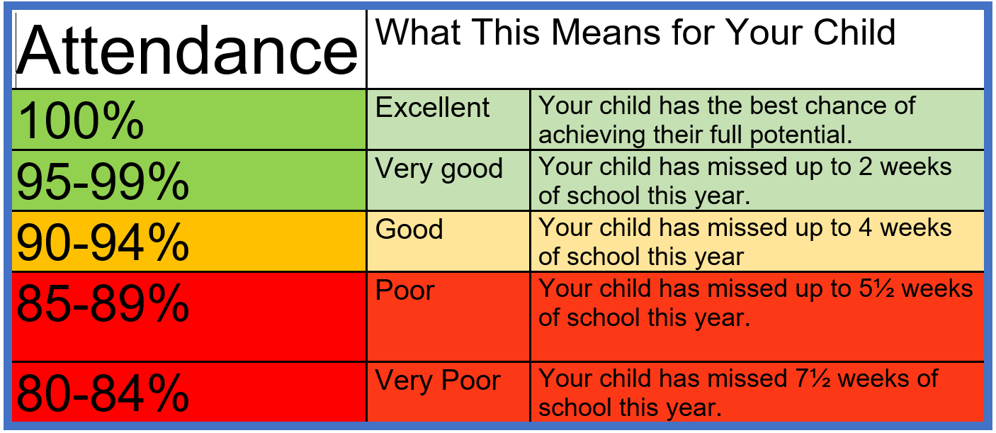 - If a child's attendance falls below 95%, they flag up on our computer system, and you will be given an attendance letter. This is to let you know of the drop in attendance. Your child's attendance and lateness will then be monitored.